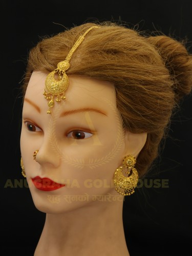 This is a beautiful gold bindiya also known as maang tikka, designed with various patterns often worn on the forehead as part of bridal or festive jewellery. It can be crafted in both 22k and 24k gold, making it a perfect choice for special occasion and heirloom piece.