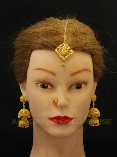 This is a beautiful gold bindiya also known as maang tikka, designed with various patterns often worn on the forehead as part of bridal or festive jewellery. It can be crafted in both 22k and 24k gold, making it a perfect choice for special occasion and heirloom piece.